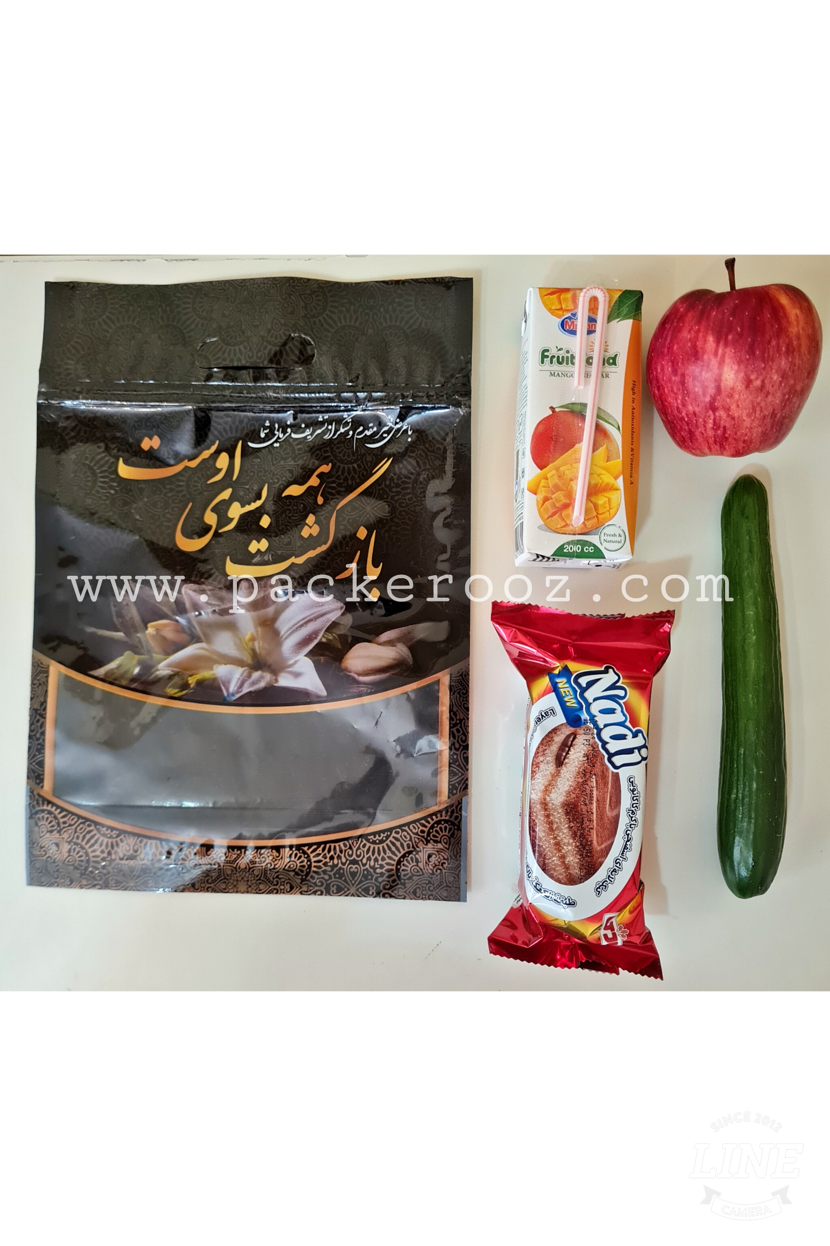 خیار مجلسی،سیب مجلسی یا نارنگی (به انتخاب خودتان) آبمیوه پاکتی، کیک تی تاب، بسته بندی زیپ کیپ.