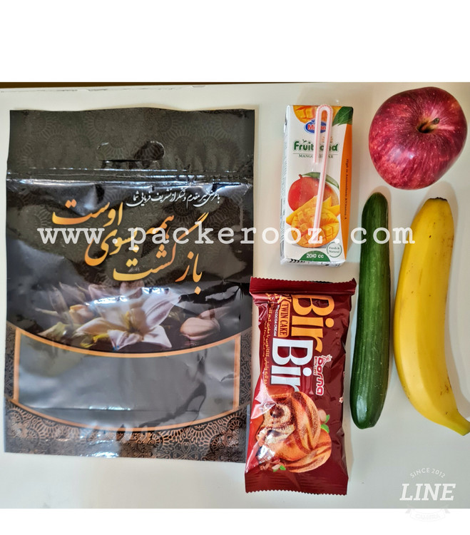 خیار مجلسی، موز مجلسی ، سیب مجلسی یا پرتغال (به انتخاب خودتان) ، آبمیوه پاکتی، کیک ، بسته بندی زیپ کیپ. ✅️لازم به ذکر است مبلغ تعیین شده زیر محصول با پک زیپ کیپ می باشد هزینه پک مقوایی ۱۳ هزار تومان اضافه مبلغ درج شده میگردد.: هر بسته ۱ عدد